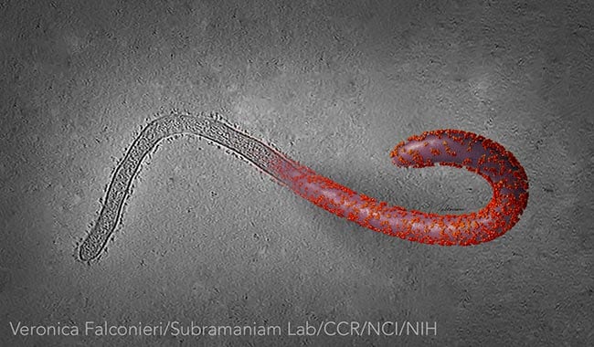 Ebola in 3D juxtaposes a real cryo-electron tomographic image of an Ebola virus-like particle and 3D model of an Ebola virus. The structure of the spike was determined by cryo-electron tomography from the tomography images. This illustration was created using Maxon Cinema4D, ePMV, and Adobe Photoshop. Recognition: 2016 NSF Vizzies Illustration Category Finalist