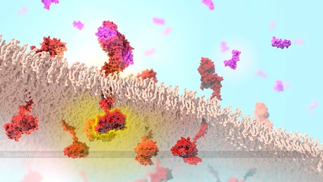 Epidermal growth factor receptor (EGFR) binds to ligand and dimerizes to initiate cell signalling. EGFR is a membrane protein and receptor tyrosine kinase (RTK) that binds to extracellular ligands and starts intracellular signaling. Mutations in the gene encoding for EGFR have been associated with lung cancer.