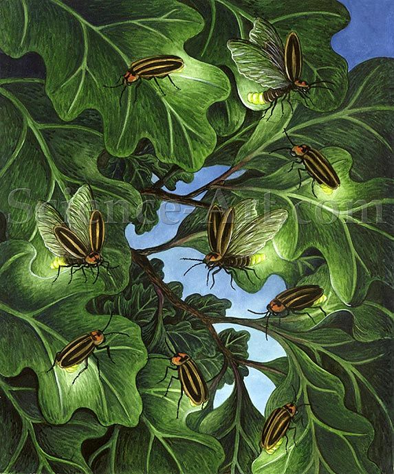 Night scene of Fireflies on White Oak leaves for nonfiction science book, “Beetles” for Scholastic, Inc.