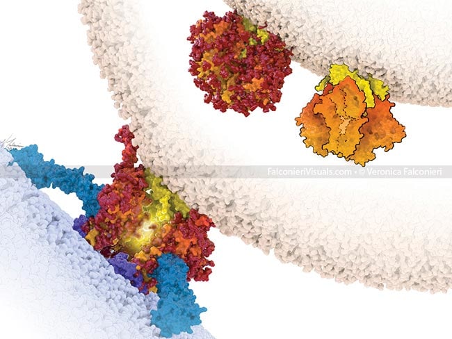 Specialized spikes (envelope glycoproteins, Env, colored orange, red, and yellow), stand out on the surface of the human immunodeficiency virus (HIV). The spikes allow HIV to attach to CD4 and CCR5 proteins (blue, purple) on human immune cells. Researchers are developing versions of Env for vaccines, so that the immune system will recognize and combat the real spikes on invading viruses if a person is exposed to HIV. Sanders et al., HIV’s Achille's Heel. Scientific American 315(6): 53.
