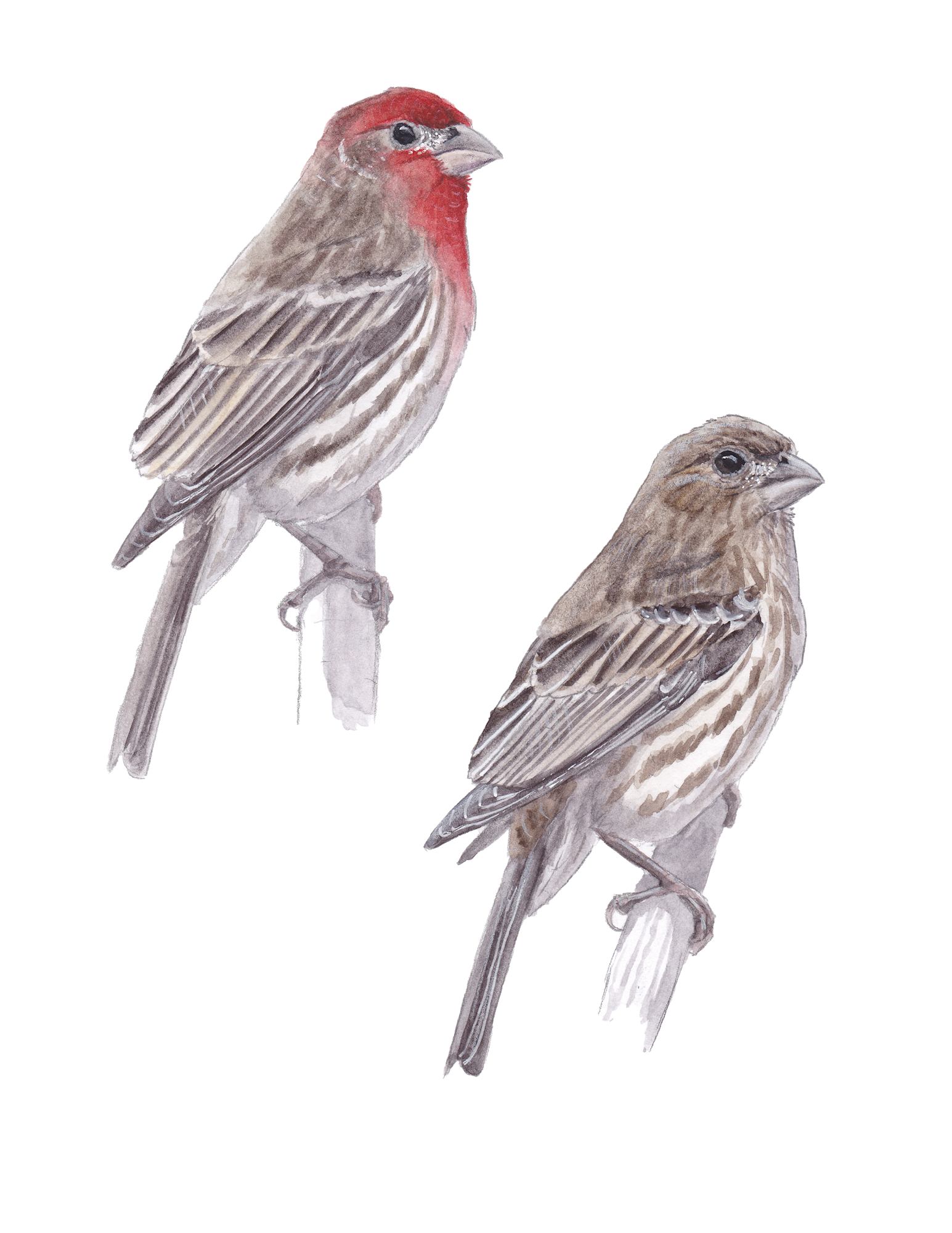 Illustration of male (top) and female (bottom) House Finches for my personal field guide project. Done on Bristol board with watercolor paints and colored pencil highlights.