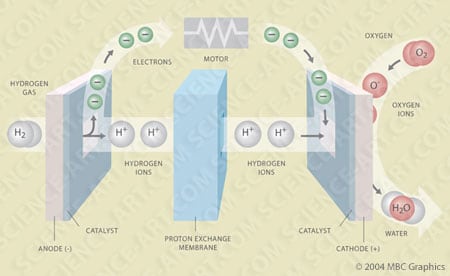 This illustration describes how a hydrogen fuel cell works. The image was created using Adobe Illustrator and Photoshop.