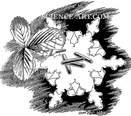 The image shows an ice crystal associated with a plant leaf and the bacterial species Pseudomonas syringae used in the product FrostBan to delay frost on garden plants.
