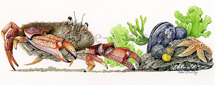 Jonah crab creeping toward mussels, periwinkles, starfish, sea lettuce and barnacles on a rock.