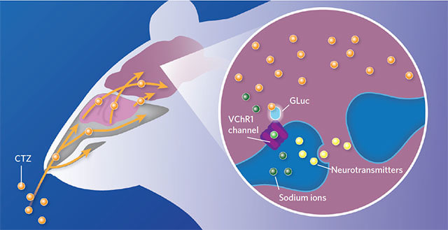 A new technique, optochemogenetics, activates light-sensitive channels inside the brain with a drug-like compound administered through the nose. Once the compound, CTZ, has entered the brain, it interfaces with the protein Gaussia luciferase (GLuc) on modified ion channels—in this case a channelrhodopsin protein, VChR1. GLuc emits light, causing the VChR1 to open and allow sodium ions to flow inside the neuron, thus stimulating the cell.