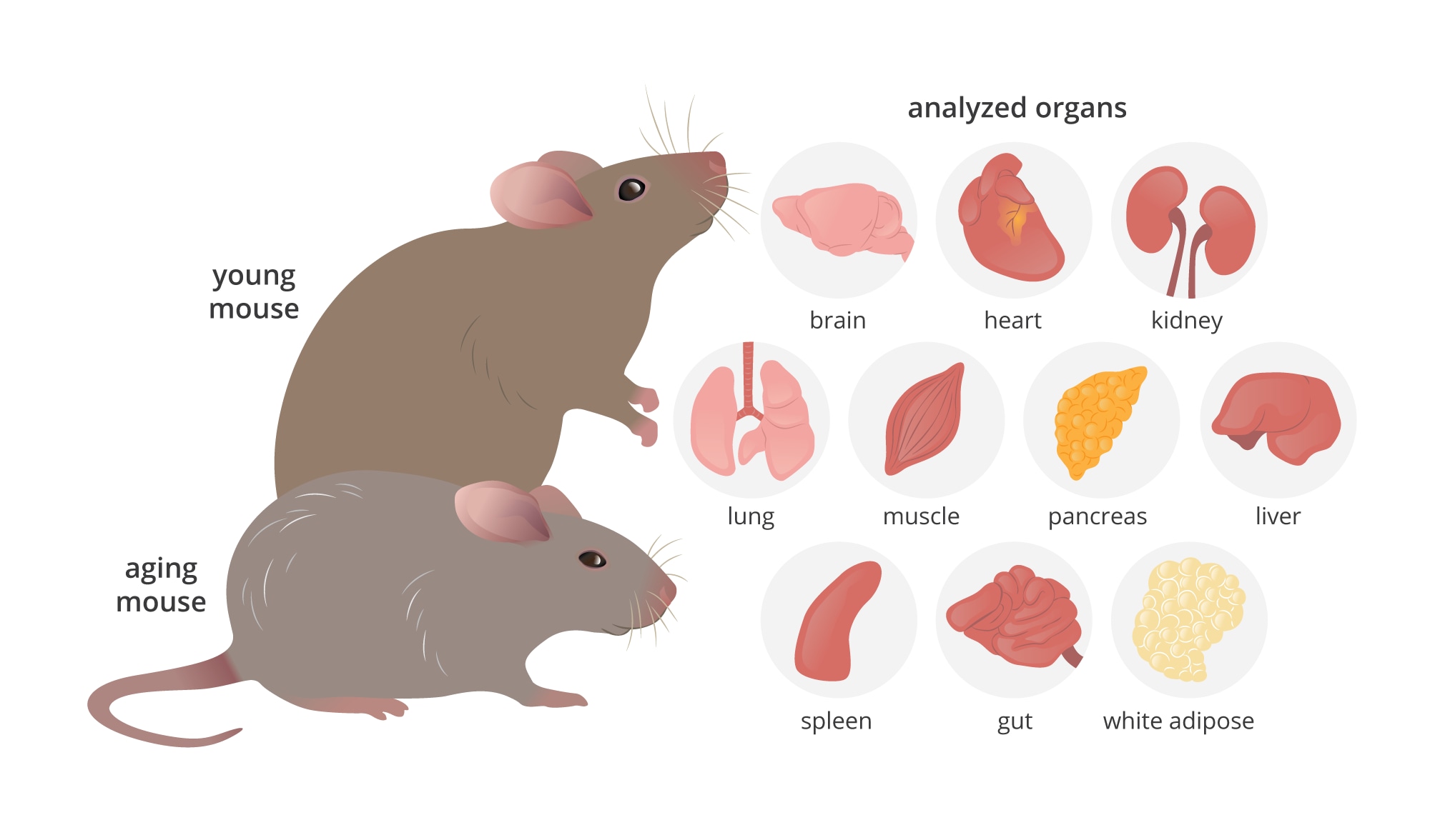This illustration was created to accompany a scientific journal entry based on research involving young vs aging mouse organs.