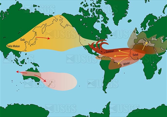 Garrison, V.H., Shinn, E.A., Foreman, W.T., Griffin, D.W., Holmes, C.W., Kellogg, C.A., Majewski, M.S., Richardson, L.L., Ritchie, K.B., and Smith, G.W., 2003, African and Asian dust: from desert soils to coral reefs: BioScience, v. 53, no. 5, p. 469–480.