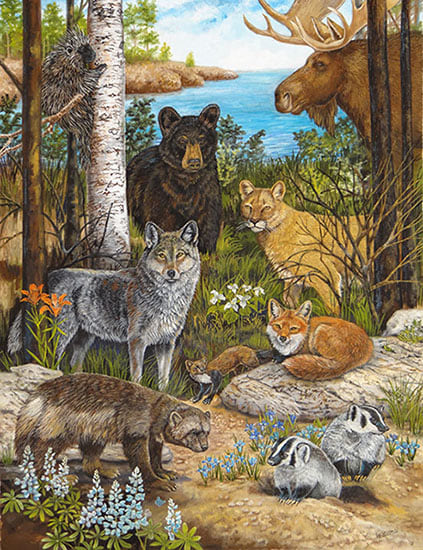 The North Woods ecosystem, animals and plants, are depicted in this gouache painting: Moose, Wolf, Porcupine, Mountain Lion, Ref Fox, Pine Marten, Wolverine, Badger, Black Bear, Trillium, Wood Lily, Lupines, Dwarf Lake Iris, Karner Blue Butterfly