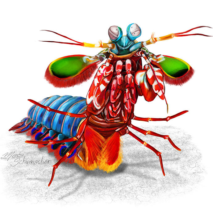 Realistic species painting of a Peacock mantis shrimp in aggressive display