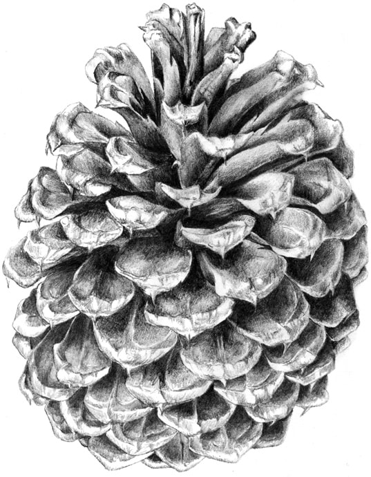 Graphite illustration of a beehive-shaped pine cone (from Pinus jeffreyi) on Bristol board. The Jeffrey pine is distinguished from Ponderosa pine by the prickles that curve inward on the cones. I collected this cone while on a hike in the Sierra Nevada and was intrigued by the spiral arrangement of the scales.