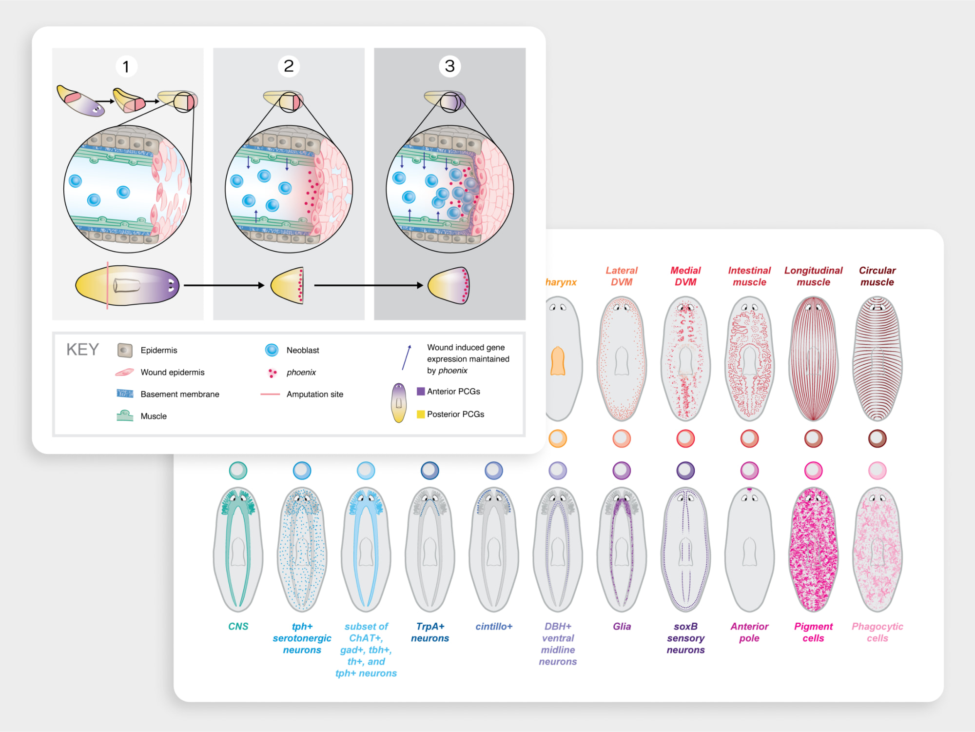 These figures were created to illustrate anatomy and cellular healing processes of planarians, to accompany a scientific journal entry.