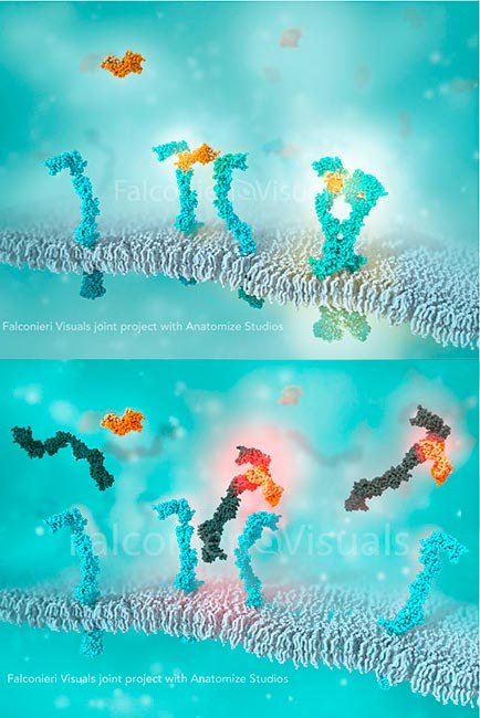 Under normal conditions, receptor tyrosine kinase Flt-1 (teal) binds to the ligand PlGF (orange). However, in preeclampsia, soluble Flt-1 (sFlt-1, dark teal) binds PlGF and prevents it from reaching Flt-1. These images use color and composition to highlight the difference between both conditions.