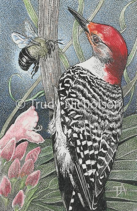 Pen and ink on scratchboard with watercolor and acrylic paint added. A scene of bird, insect and blossom interacting to create a nature scene. Red-bellied Woodpecker,(Melanerpes carolinus), Carpenter Bee,(Xylocopa spp), and Rhododendron blossom.(Ferrugineum).