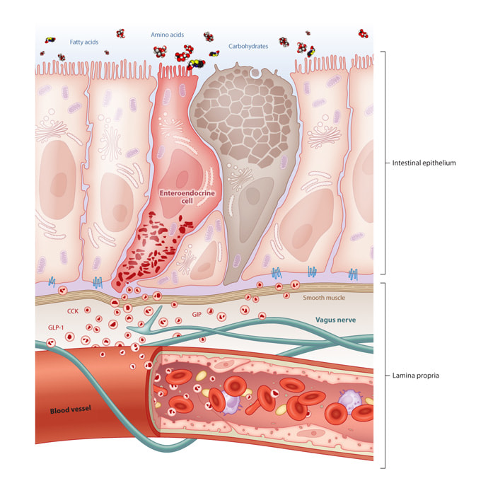 Dietary nutrients are sensed along the intestinal epithelium via taste receptor–expressing sensory cells that form part of the enteroendocrine system. Stimulation of these cells results in the release of gut peptides that influence the hunger-satiety cycle. Once released, gut peptides can function locally in a paracrine fashion, via an endocrine effect using blood distribution, or via synapsis with the neuropods of the vagal nerve. Adobe Illustrator.