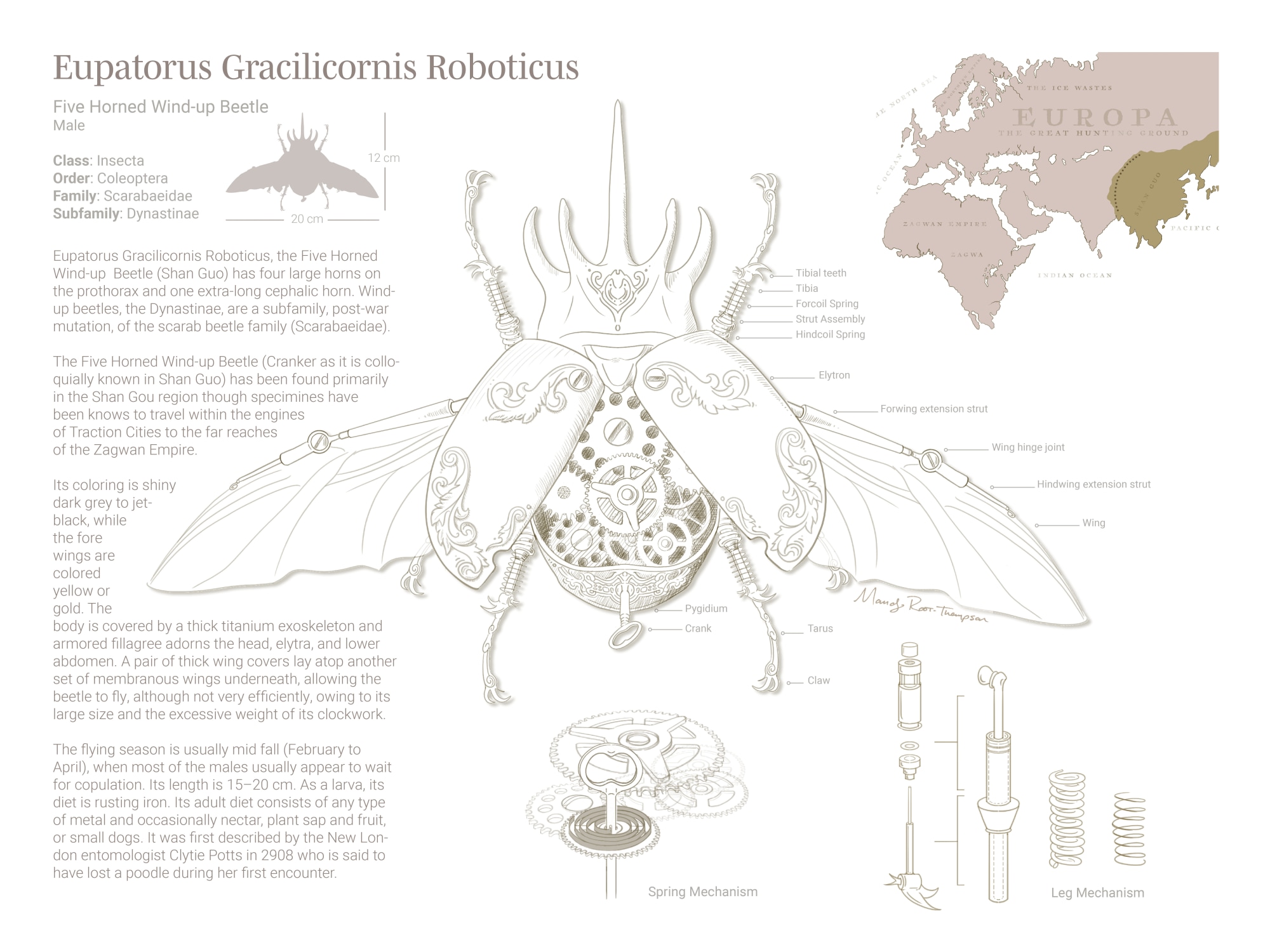 A play on a Linnean-style entomology plate. The original subject was a Five Horned Rhinoceros Beetle. The book/movie Mortal Engines inspired the text and the continent diagram. The mechanical parts are taken from both clock and motorcycle references.