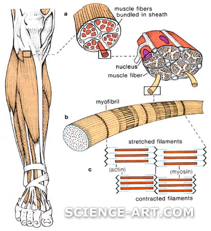 Science high school text book illustration describing skeletal muscle tissue at successive magnification. Traditional illustration.