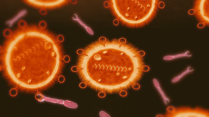 Illustration showing an example of the use of synthetic biology, to create bacteria engineered to detect the presence of parasites. This bacterium contains both its own DNA (green helix) and an artificial part (blue) that codes for the production of surface proteins (circles) and other internal structures. These proteins are tailored to detect the presence of Schistosoma parasites (pink), the cause of the tropical disease schistosomiasis. When the parasites are detected, the internal structures change the colour of the bacteria to red. Engineering bacteria normally present in the water in high-risk regions could provide a warning to people that the water is contaminated by the parasites, as it would turn red in their presence.