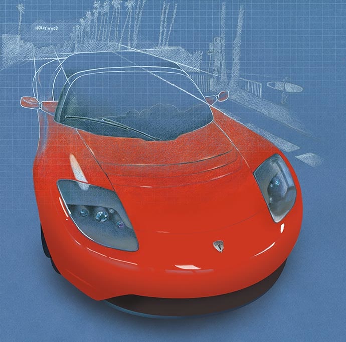 Tesla Roadster. Mixed media on paper and in Adobe Photoshop.