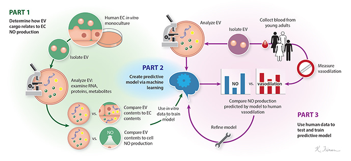 Flow chart illustration explaining the concept of using extracellular vesicle (EV) contents as predictors of cardiac health.