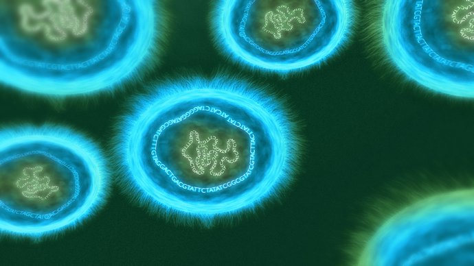 DNA uptake by a cell. High resolution image. In this process, a foreign strand of DNA (blue) enters the cell, and the cell's colour changes to match that of the new DNA, indicating that genes in the new DNA are being expressed. There are numerous examples of new DNA being incorporated into cells and expressing its genes. For instance, specific genes can be artificially introduced to bacteria to confer desired properties, such as the ability to produce the hormone insulin.