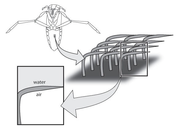 Special hairs on the body of a water boatman trap air and keep a bubble near the body. Adobe Illustrator.