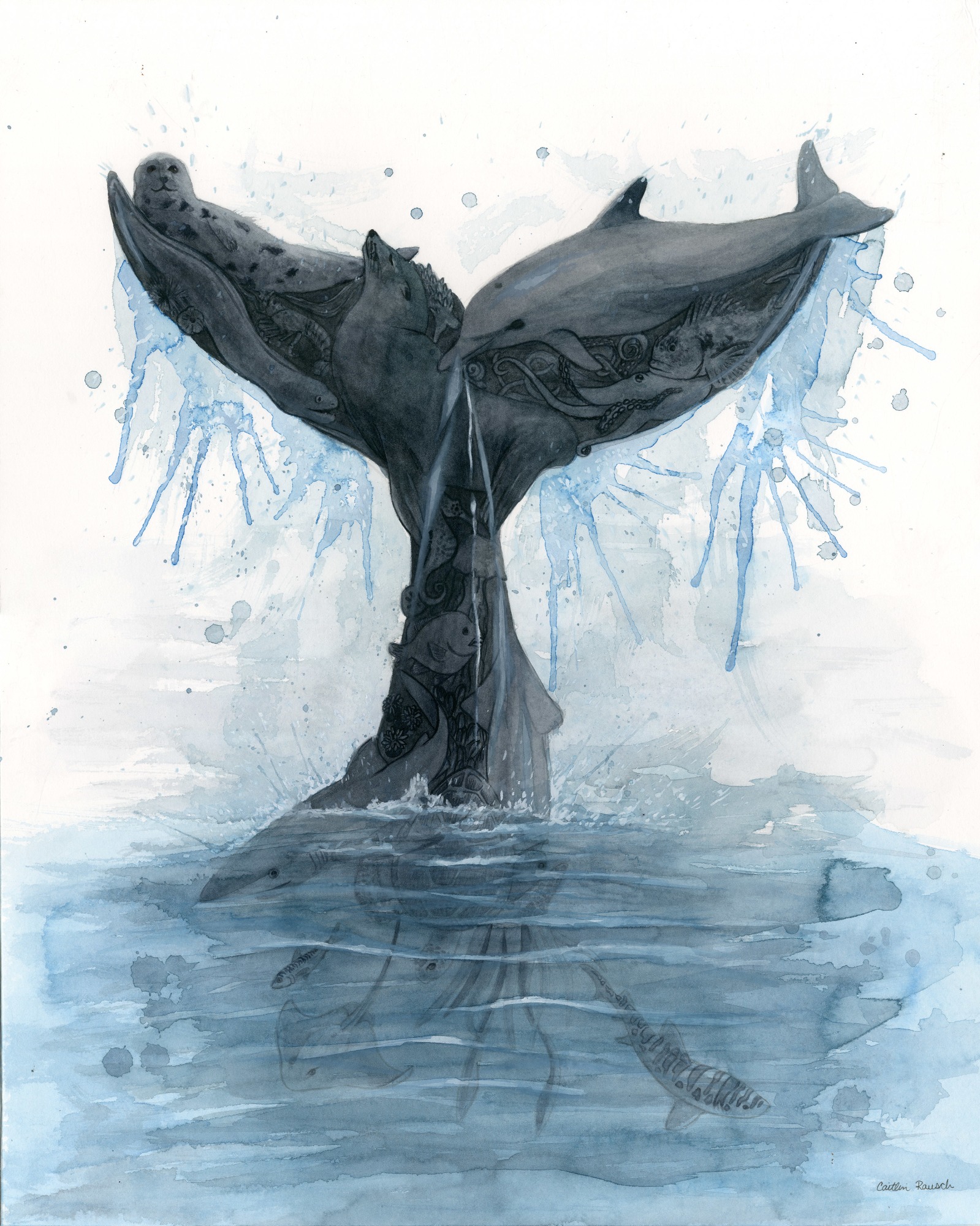 This piece was created for a biologist to illustrate various types of marine life found on the California coast, and to show the connection they share in the form of a collage into a whale tail.