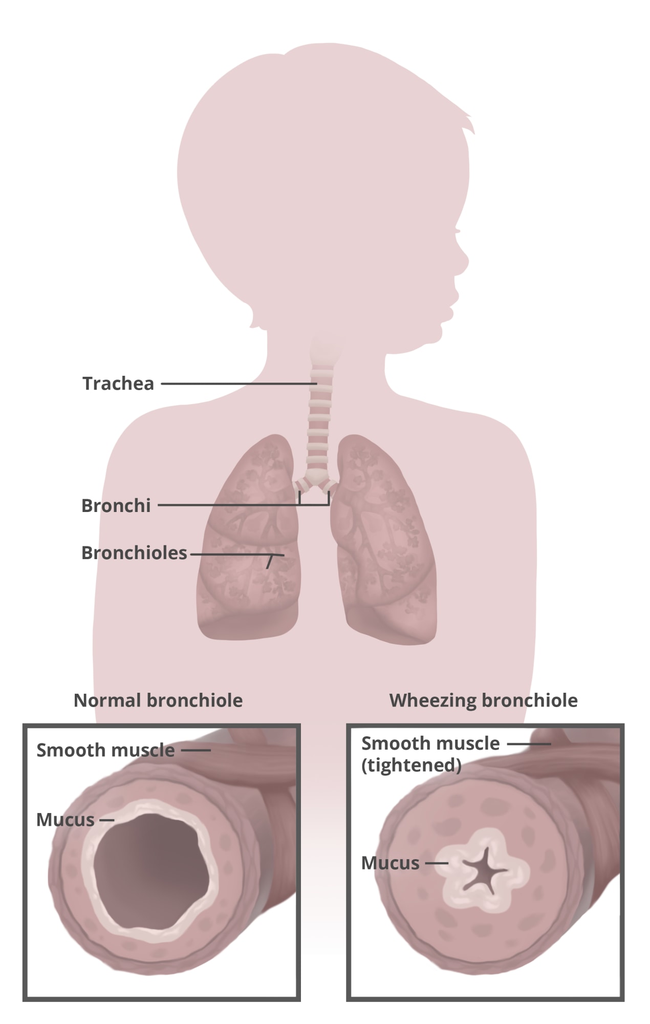 This piece was created for an educational series for new parents on common childhood conditions, illustrating a wheezing bronchiole caused by tightened smooth muscle and excess mucus in the lungs.