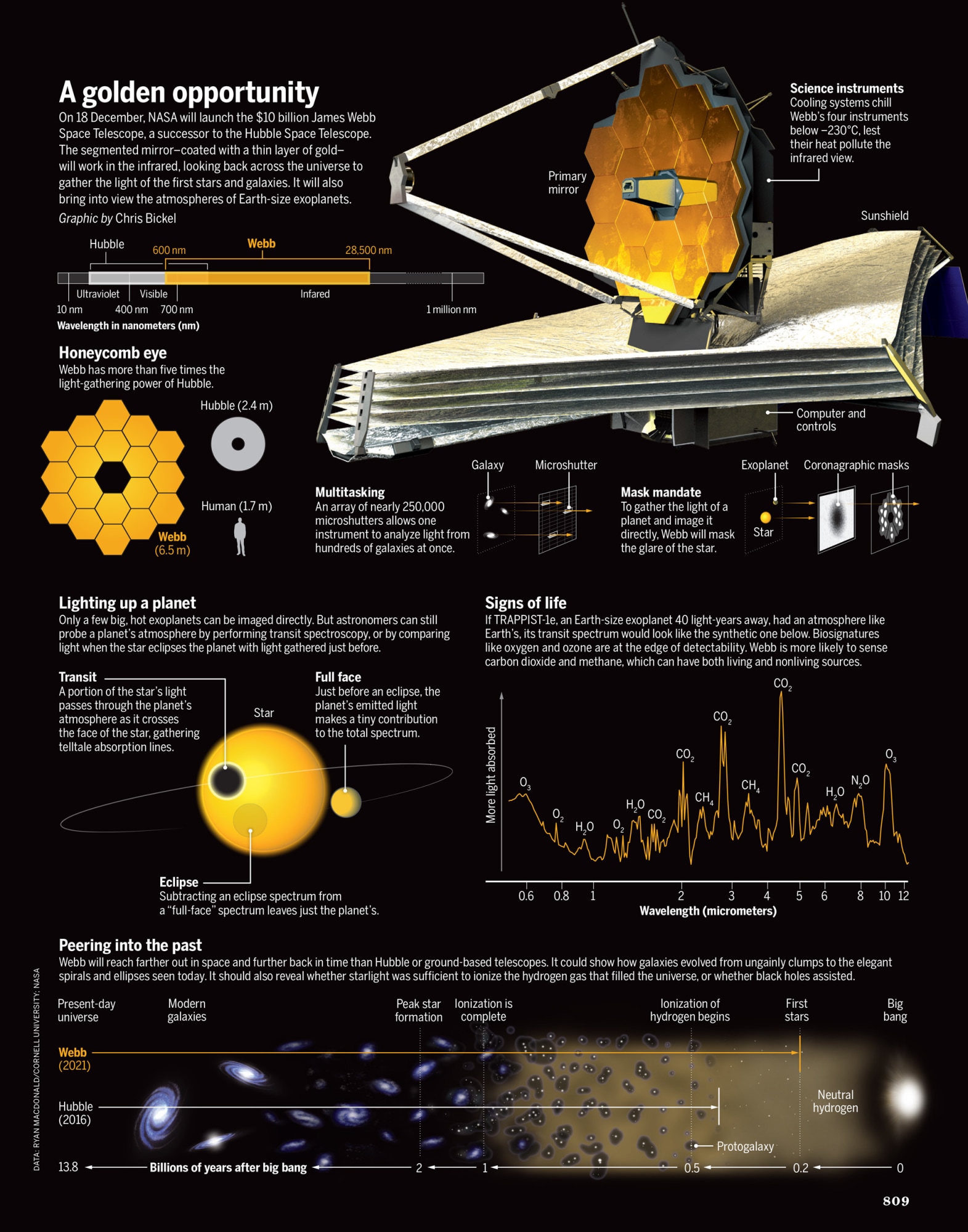 On 25 December, NASA will launch the$10 billion James Webb Space Telescope, a successor to the Hubble Space Telescope. The segmented mirror–coated with a thin layer of gold–will work in the infrared, looking back across the universe to gather the light of the first stars and galaxies. It will also bring into view the atmospheres of Earth-size exoplanets.