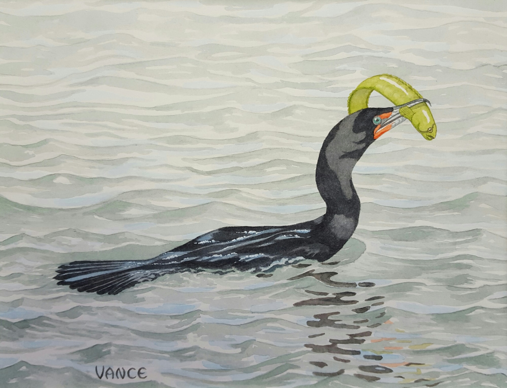Rendering of a double-crested cormorant, Phalacrocorax auritus, consuming a penpoint gunnel, Apodichthys flavidus.