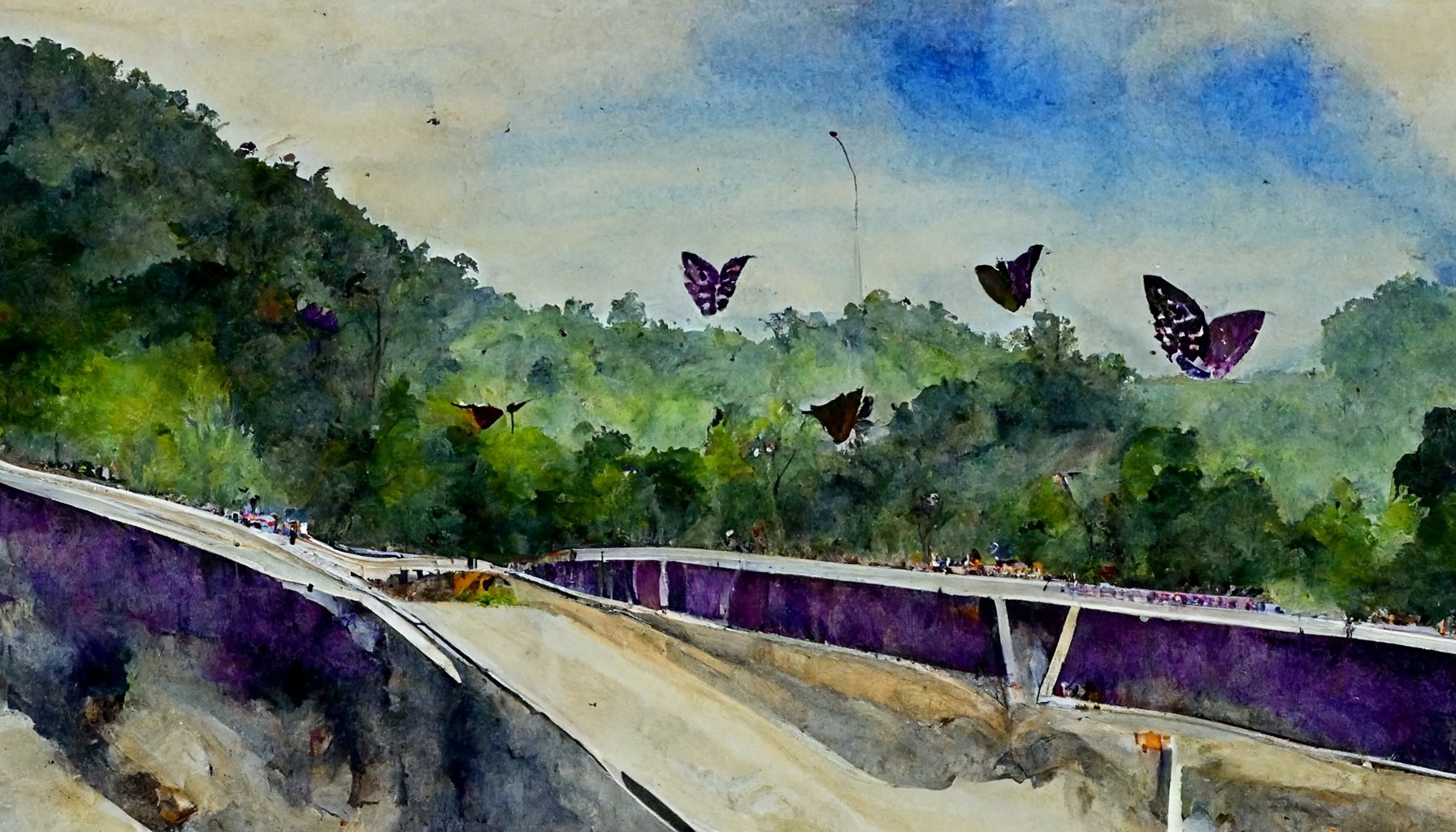 There are four species of purple crow butterflies in Taiwan: Euploea mulciber, Euploea eunice, Euploea sylvester, and Euploea tulliolus. Every year after March, they will return gradually in groups to their breeding sites northward to reproduce. By using MJ as a drawing tool, it presents the ecological characteristics of the purple butterfly freeway lane with a simple watercolor style, which fuses reality and fiction.