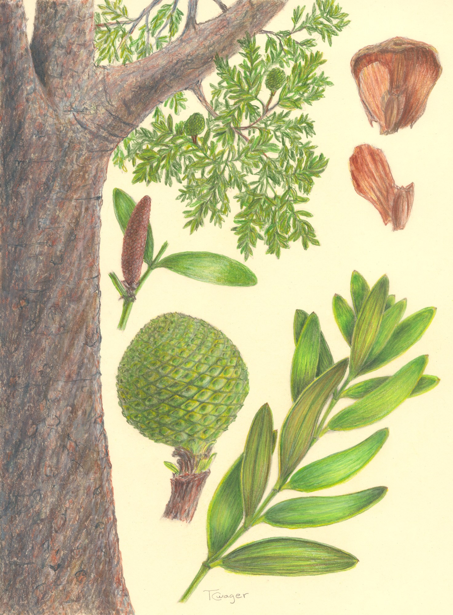 Native to New Zealand, Agathis australis, the ancient Kauri tree can live over 2000 years, grow to over 50 meters tall, and over 20 meters in width. A die-back disease has ravaged historic groves in New Zealand and the Kauri tree is now endangered. This illustration is one of twenty three contributing plants I drew for inclusion in Cultural Landscape Reports for 3 military installations on the Island of Hawaii. The Center for Environmental Management of Military Lands (CEMML) created the reports for the U.S. Army Garrison, Hawaii.