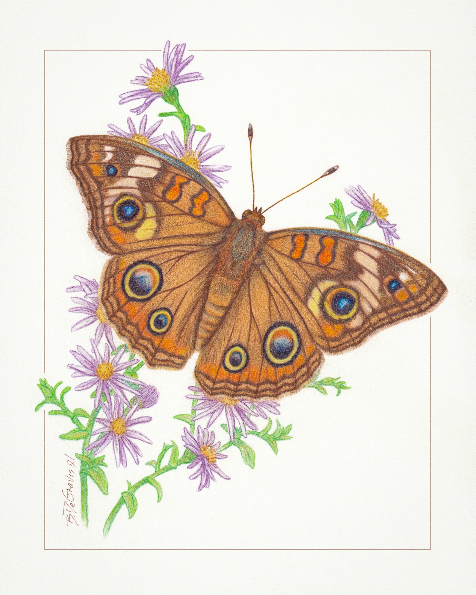 Observations and reference photographs were made in my own pollinator habitat gardens. The vibrant Common Buckeye Butterfly (Junonia coenia) with its large eye spots is a brushfoot usually seen in late summer and into the fall. Since they are a migratory species that moves south in the fall, they need late season nectar sources such as asters. The native perennial, Calico Aster (Aster lateriflorus) growing in my garden was chosen as the perch for the Common Buckeye.