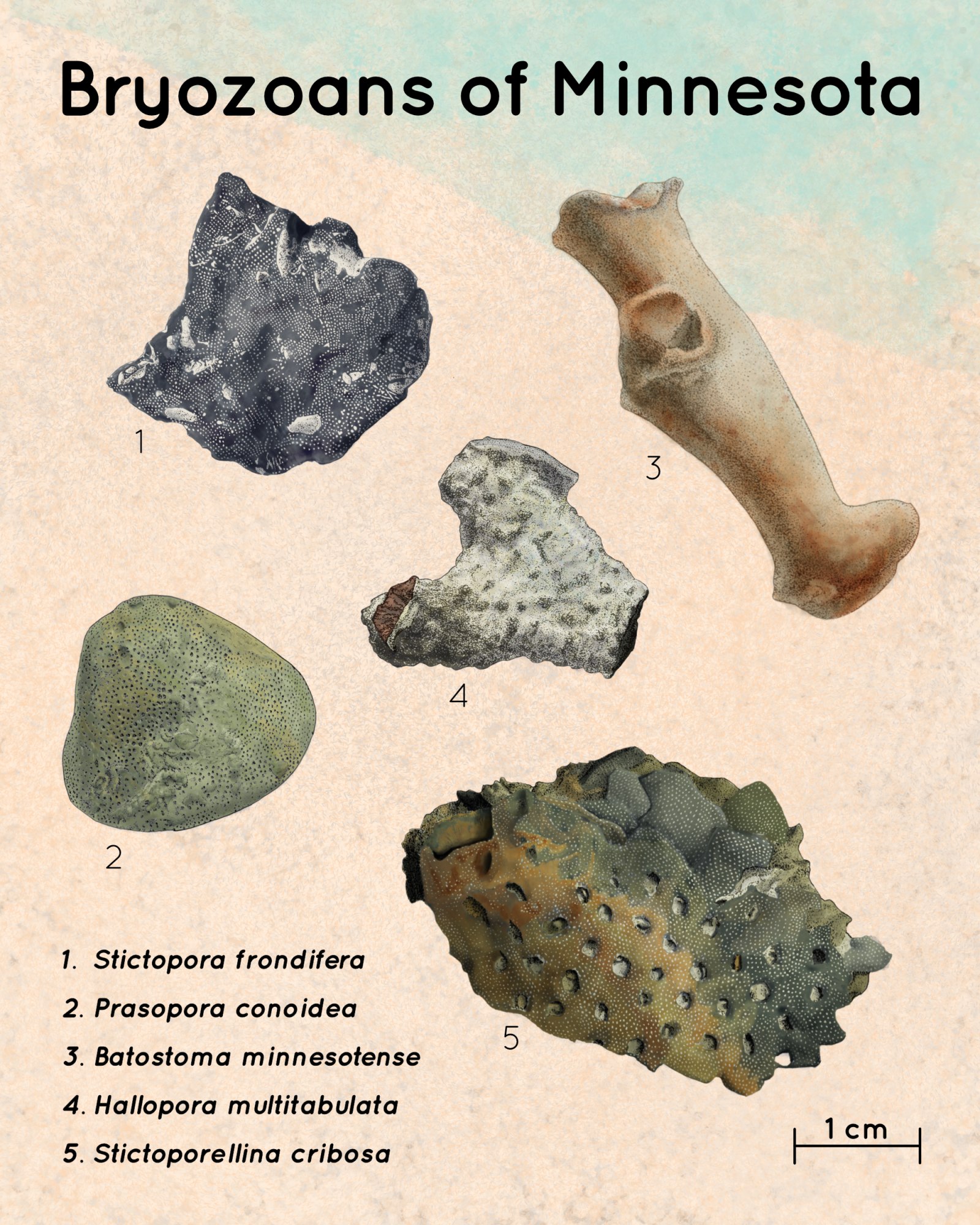 Bryozoans are a very old lineage of colonial animal, having first appeared 500 million years ago. They are one of the most common fossil organisms in Minnesota.
