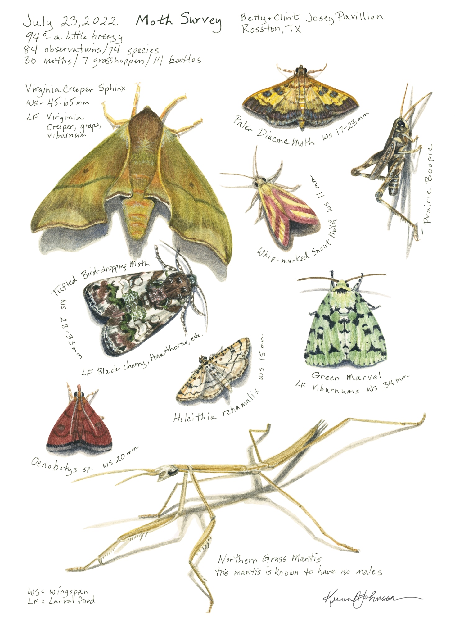 This piece gives a glimpse into the diversity of moths and insects found while black-lighting with a white sheet near a prairie in Texas. Moths come in all shapes, sizes and colors as they mimic their environment to avoid being eaten. Other insects observed were a Northern Grass Mantis and the Prairie Boopie grasshopper.