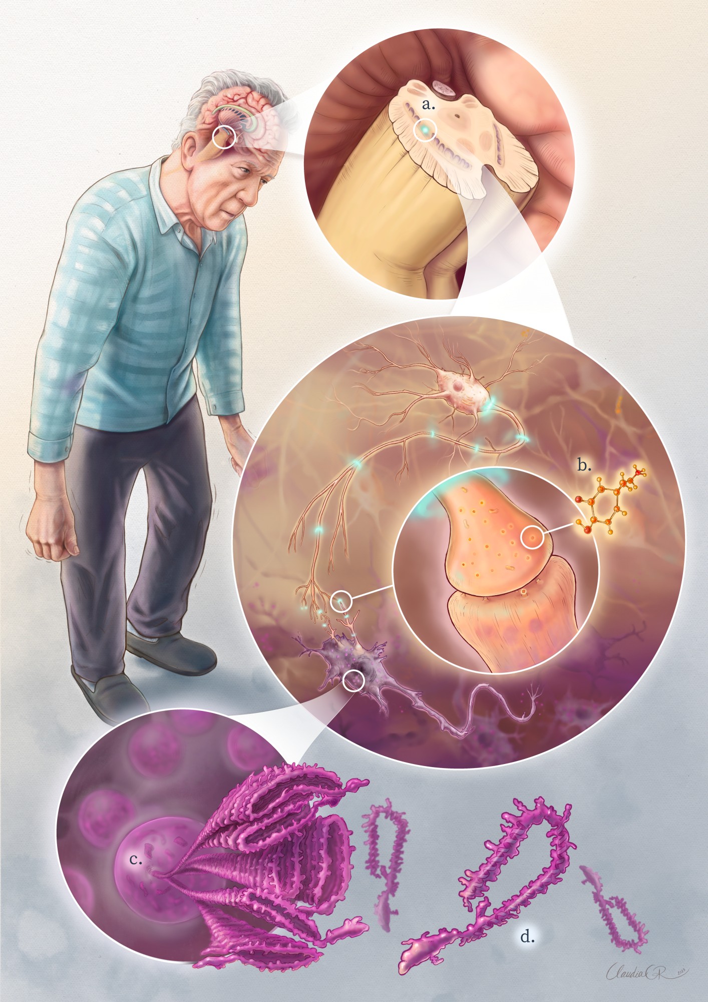 The accumulation of Lewy bodies (c) in neurons is another common factor in this condition. These bodies are composed, among other substances, of alpha-synuclein (d) protein deposits that in large amounts are toxic to neurons.