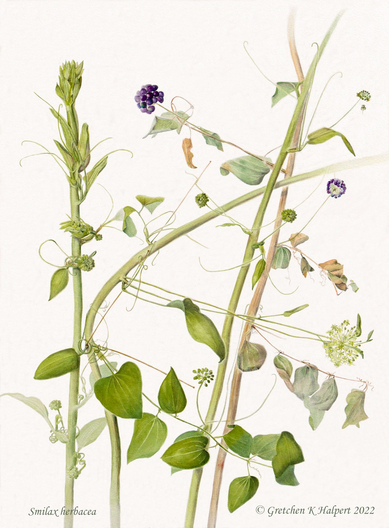 Also known as Catbrier and Carrion Flower, Smilax herbacea is a thornless brier with medicinal qualities. Birds eat the berries, deer and rabbits forage the leaves. Flies, particularly carrion flies, serve as pollinators.