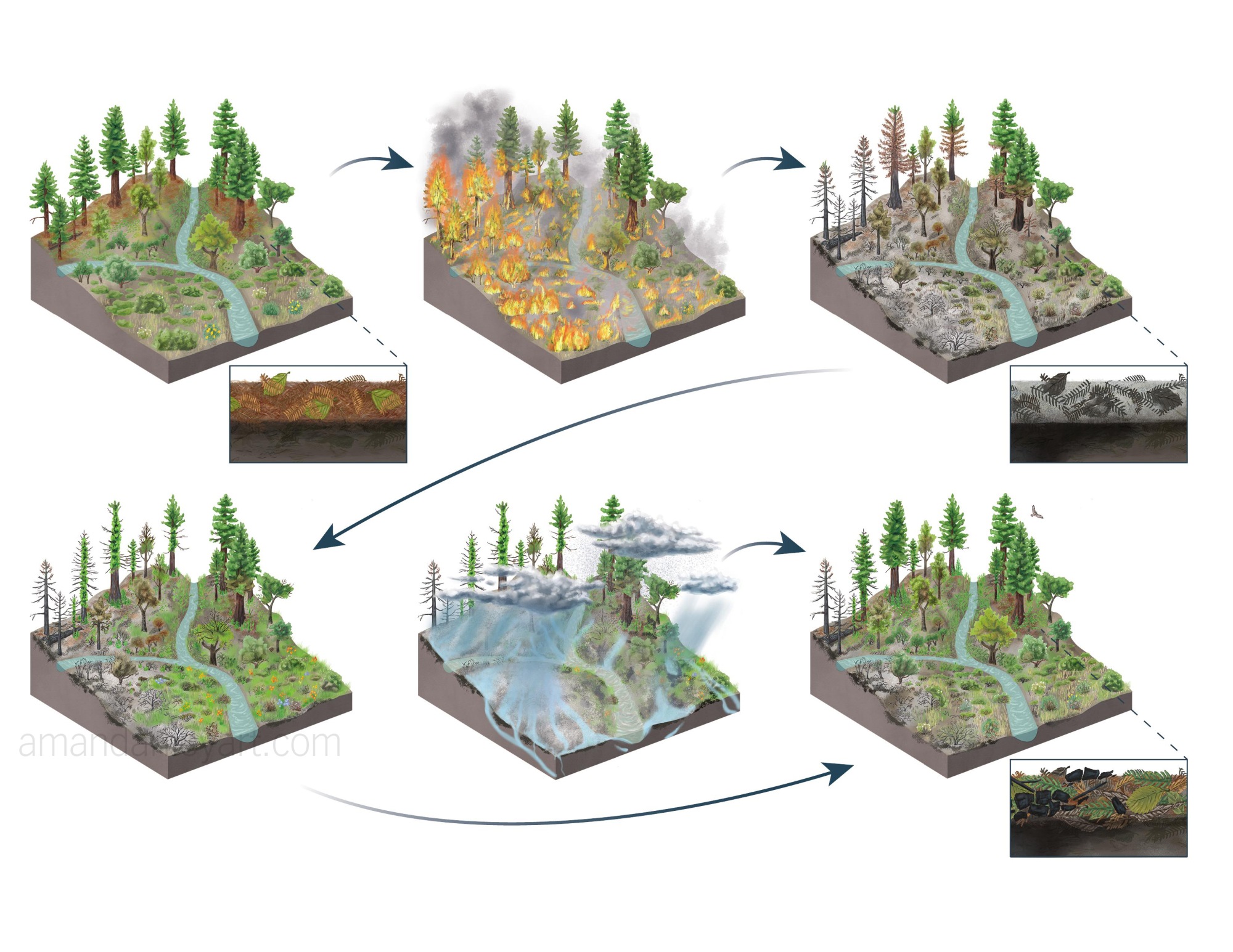 Factors that affect stream chemistry before and after wildfire: landscape heterogeneity (vegetation, slope, soil), wildfire character, post-fire recovery and ecosystem change, precipitation (type, amount, duration, intensity, season), and evolving landscape recovery and diversity. Zoom-ins show the evolution of leaf litter and soil composition, specifically ash and burned material, that generate and impact sources of stream solutes. I got to work with Dr. Christina Richardson and team at UC Santa Cruz to make this conceptual diagram for their upcoming paper, "Non-uniform stream water chemistry responses to wildfire in watersheds with varying burn extents," a study of stream and soil chemistry in the Santa Cruz mountains before and after the CZU Lightning Complex fires of fall 2020.