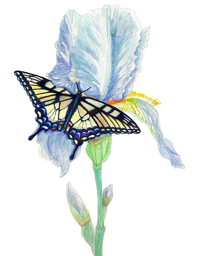 The Iris bloom I used as a reference for this image was drawn from one of my grandmother's bulbs, which their rhizomes are older than I am and were passed down to me by my aunt Sallie. The composition celebrates the delicate balance butterflies embark upon while landing to drink nectar from a flower.