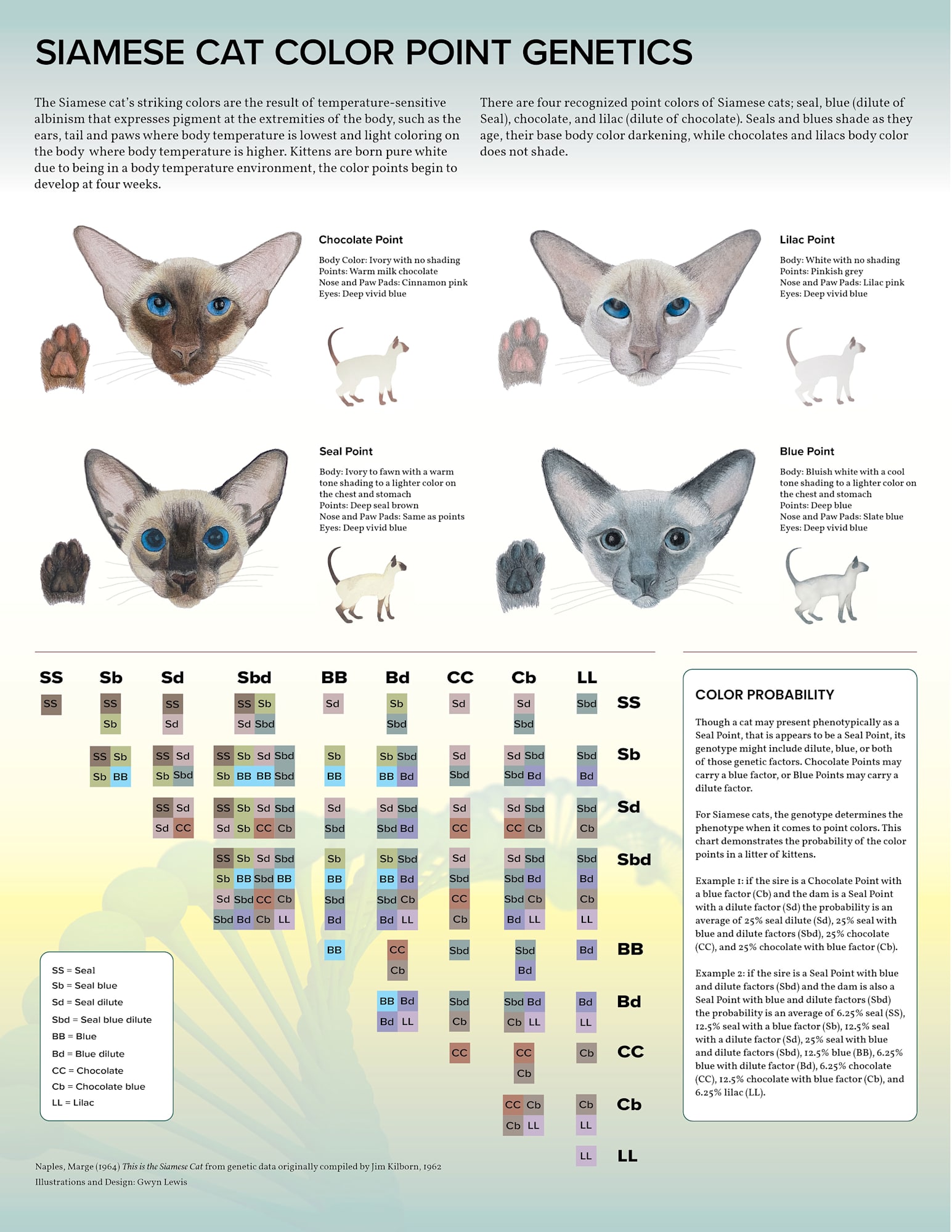 The poster reflects the color points accepted by the Cat Fanciers' Association in the United States. It also incorporates genetics to show the probability of the color points possible in a litter of kittens depending on the color points of the parents.