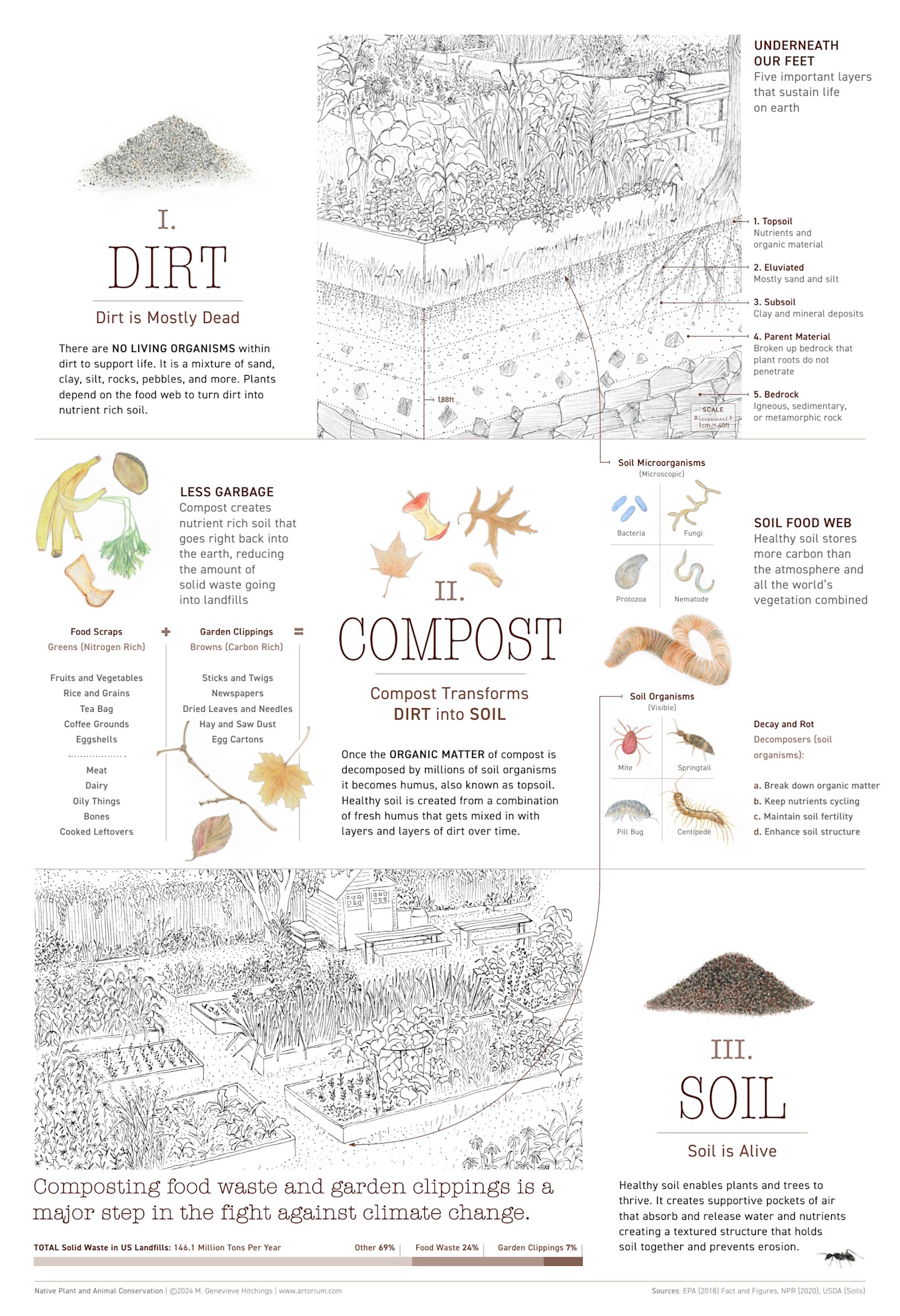 The infographic calls attention to soil organisms' role in breaking down food waste and creating nutrient-rich soil that goes right back into the earth, reducing the amount of solid waste that would otherwise end up in landfills.