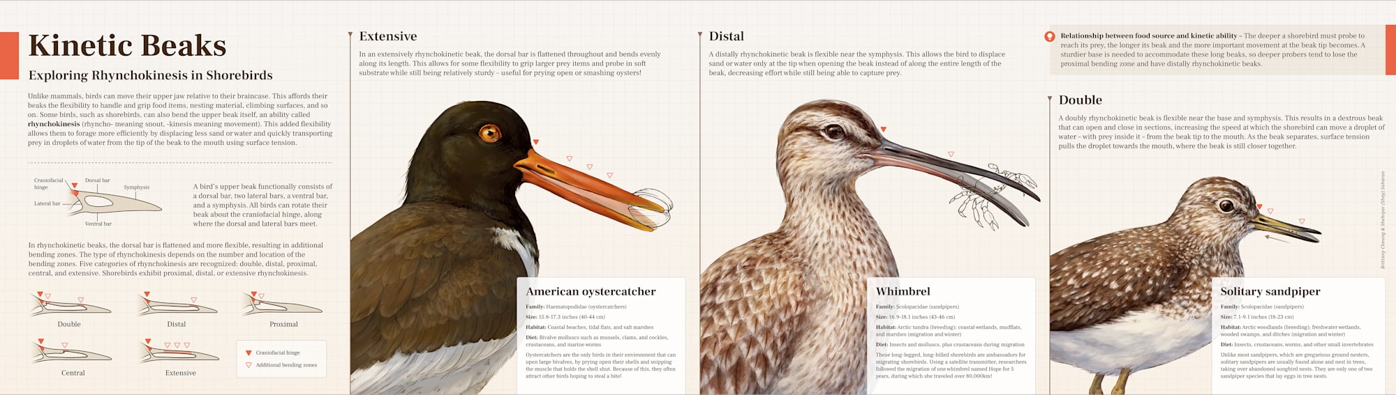 Some birds can not only move but also bend the upper beak (rhynchokinesis). This infographic teaches a lay audience about the different types of rhynchokinesis, using shorebirds as an example of how this ability confers evolutionary advantages. Created in collaboration with Shehryar (Shay) Saharan.