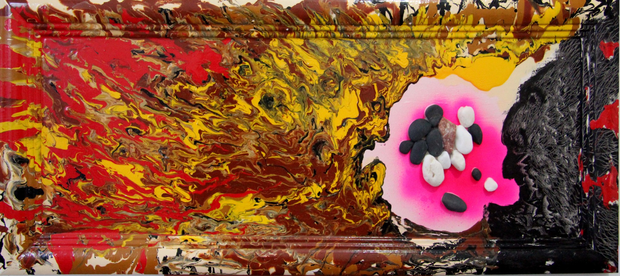 Oil, pebbles, mixed media on repurposed wooden door (black ground)