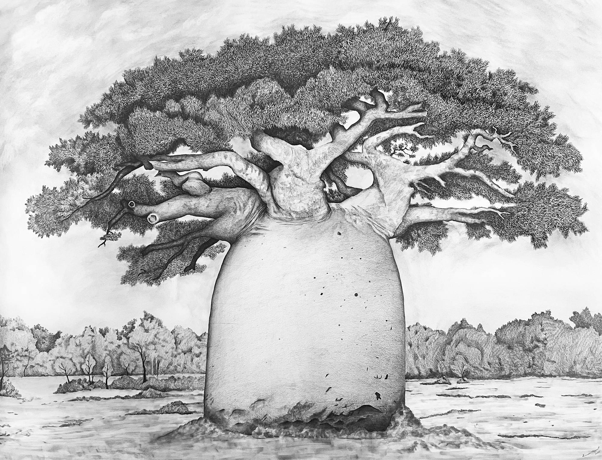 MessageThis graphite drawing depicts a monumental baobab tree rendered in intricate tonal gradations, capturing the immense girth of its trunk and the twisting, almost architectural limbs that reach skyward. Every ridge, fissure, and weathered fold of bark is articulated with patient mark-making, emphasizing the tree’s endurance and slow accumulation of time. The drawing’s restrained palette allows texture, shadow, and light to take center stage, evoking a quiet reverence for the subject’s scale and longevity.