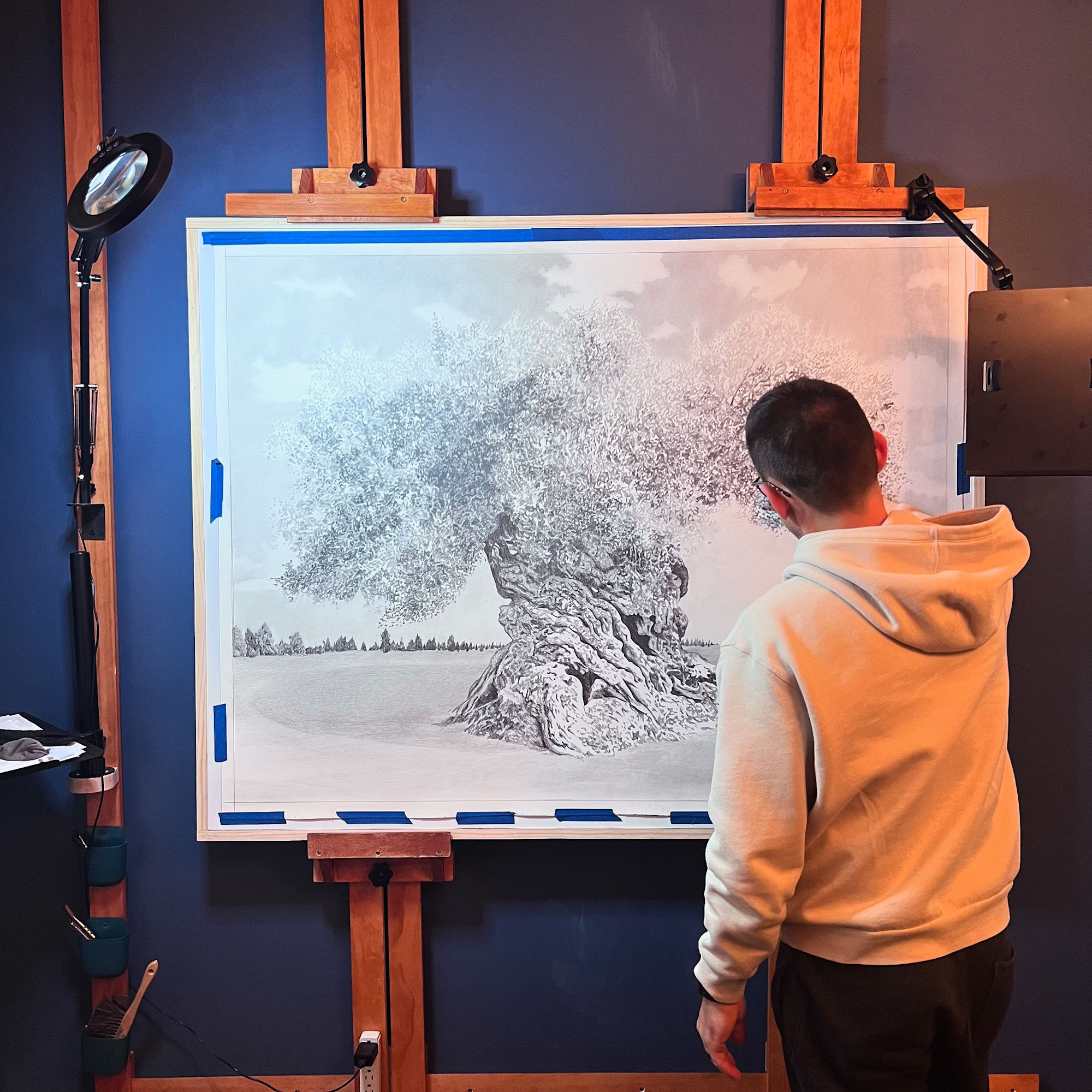 Graphite, with its ability to convey rich depth and subtle tonal variation, is an ideal medium to express the contrast between permanence and impermanence. The monochrome palette emphasizes the tree’s sculptural quality, allowing light and shadow to reveal the patterns of age and growth. Just as olive trees have been cultivated for their fruit and their symbolic significance, this drawing seeks to cultivate an awareness of the quiet strength embedded in nature.