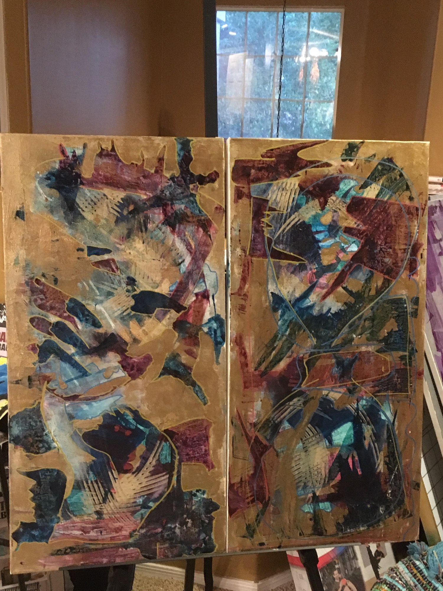 This piece literally is its name. The background is a golden gesso while the intermixed colors are from a special release muted ink collection. After mark making, an hourglass revealed itself.