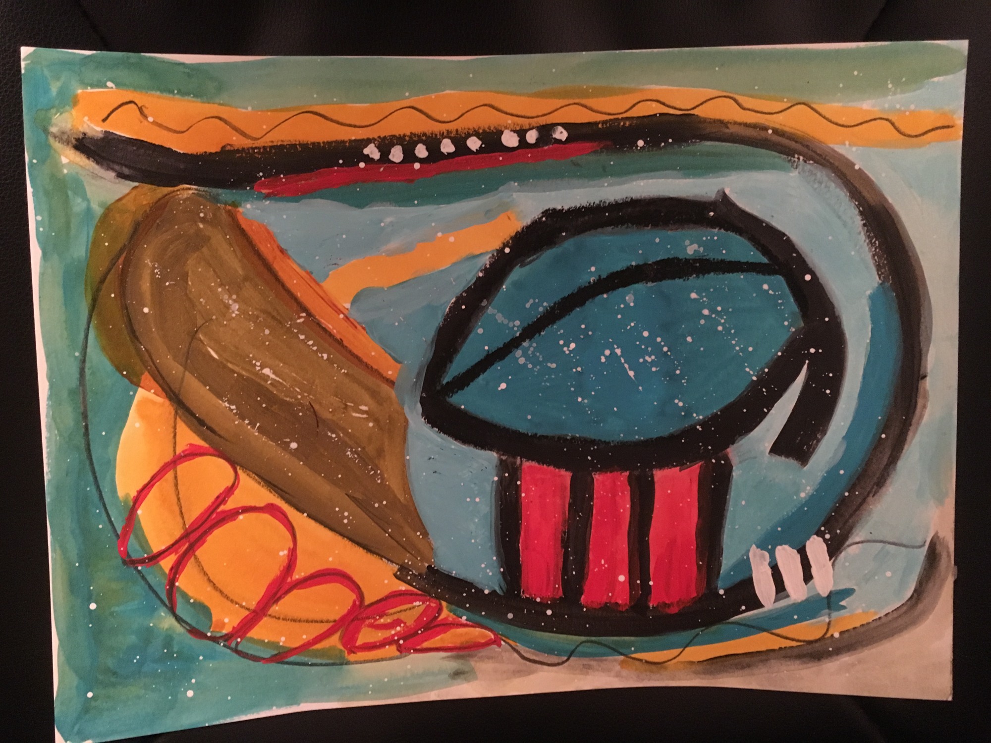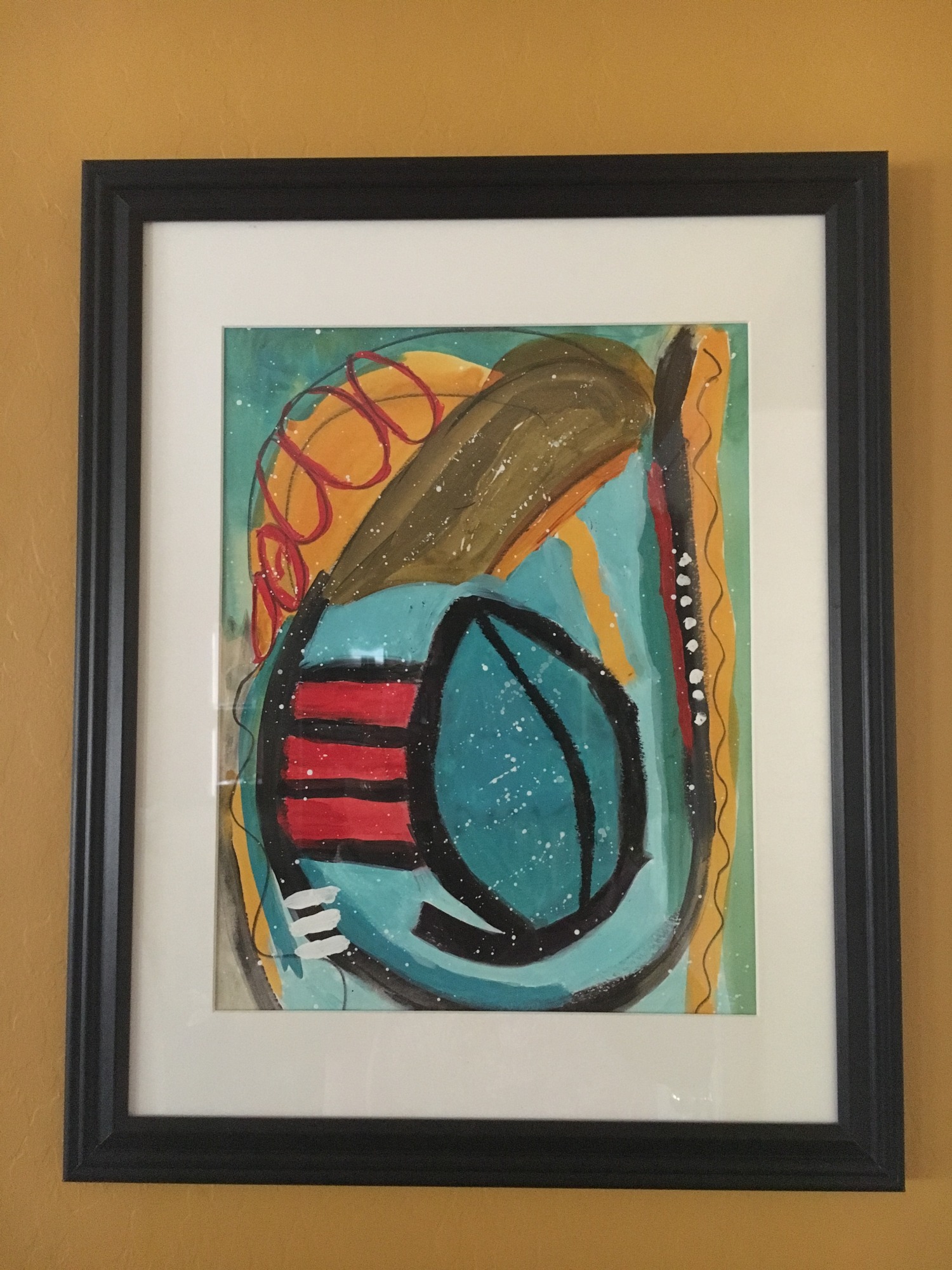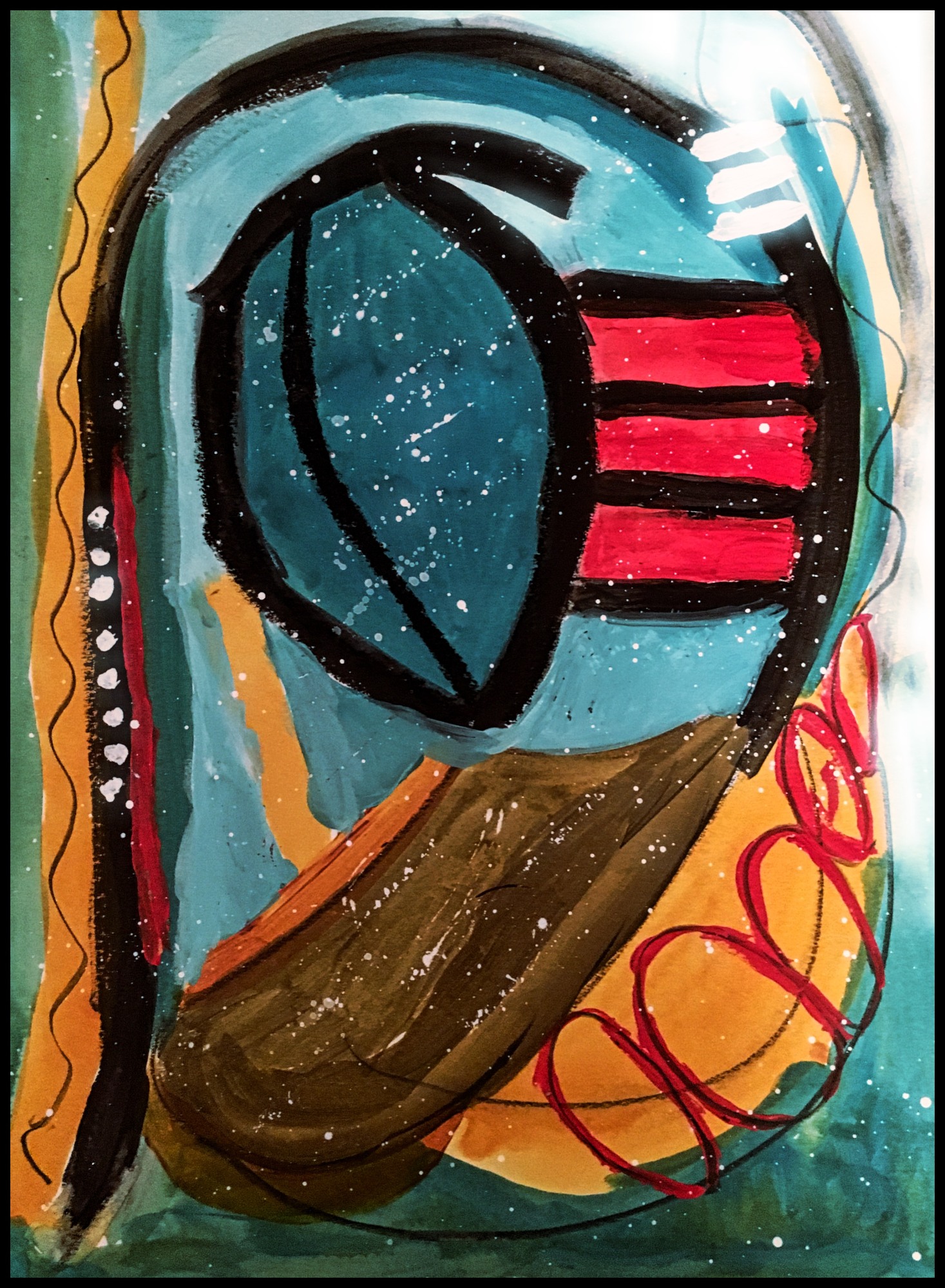 Created in Mike DiGuillio's, Secrets of Abstract Paintings class at Art of the Carolina's in North Carolina. The big secret was to have a signature mark that is used in every painting. I promptly forgot what his was. But what I gained from the class was to vary the size and type of lines used in your composition. We emphasized straight, curved, swirly, fat, thin and thick. Mike chose the color palette by walking from table to table with a new color every few minutes. When critiquing my paintings he stated they looked very tribal and much to my surprise and delight noted that they were ready to be framed and hung. I added rings (squished circles) and white sprinkles when I got home to complete my works.