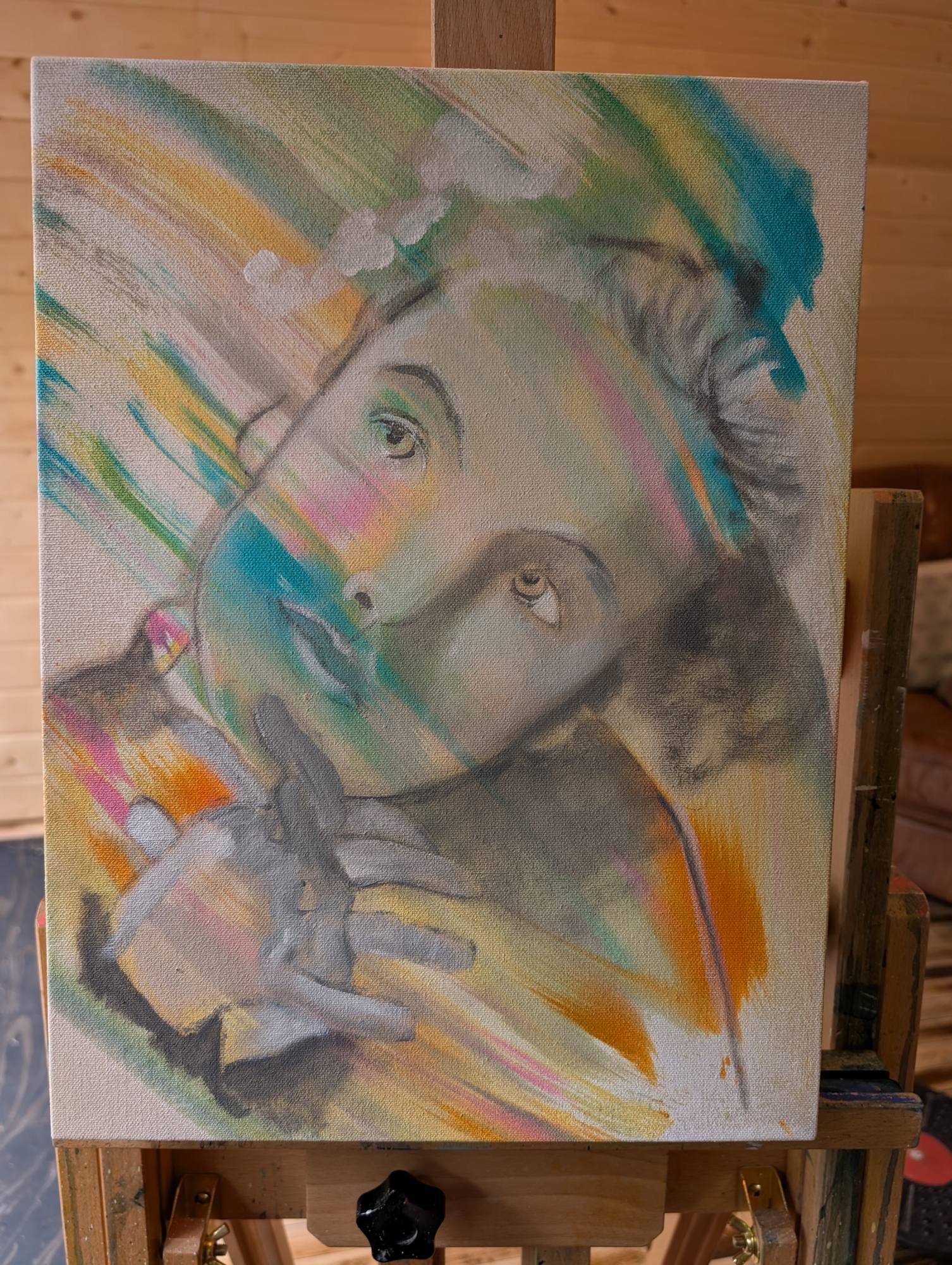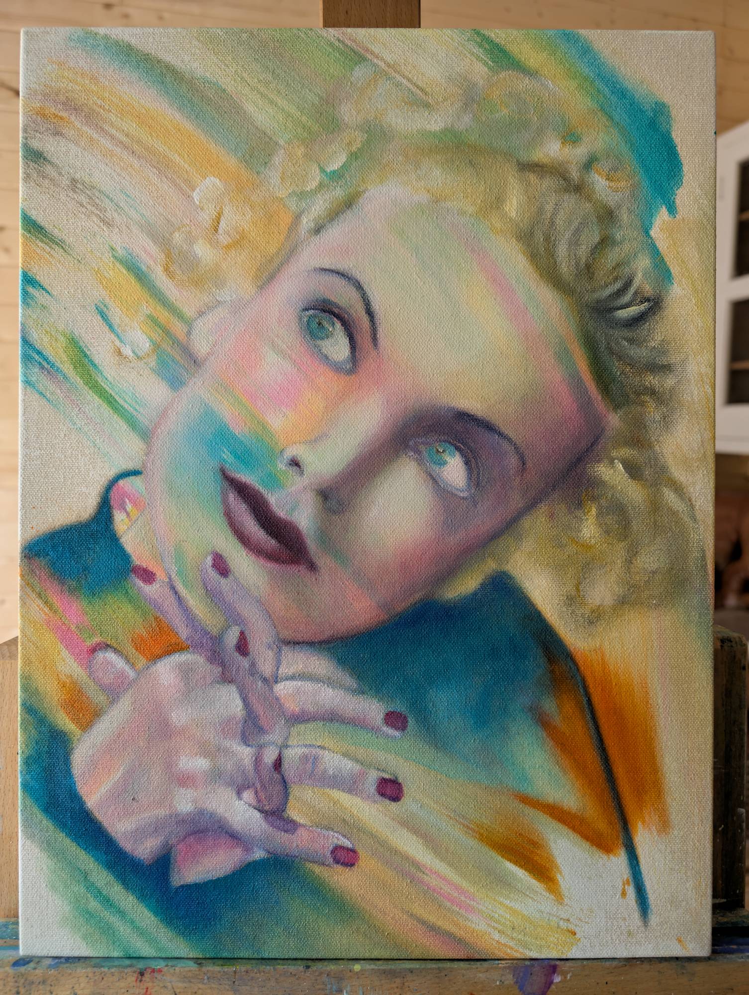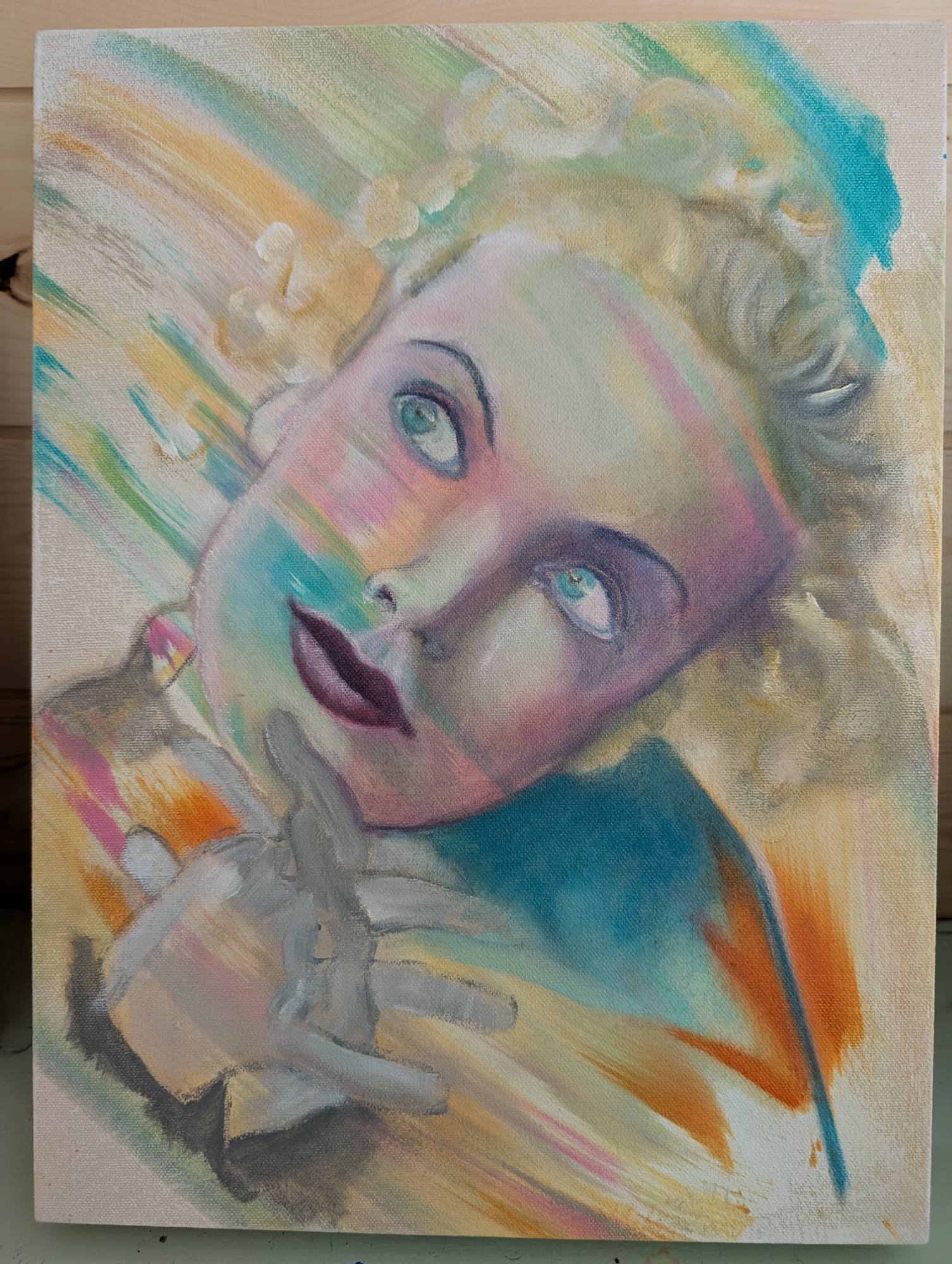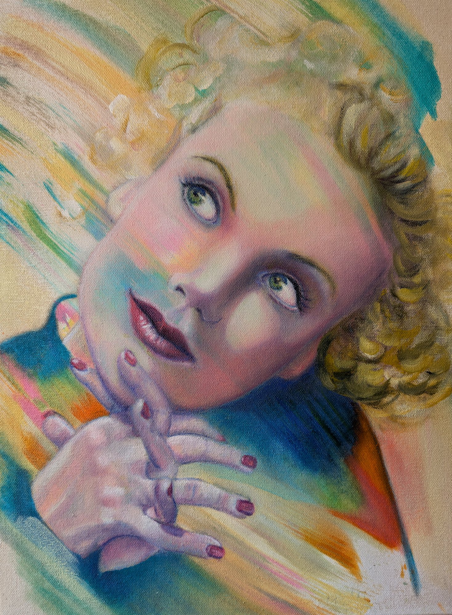 A colourful dreamy tribute to the golden age icon Carole Lombard. This painting captures her charm through a swirl of pastel hues and expressive light. Hollywood glamour with fluid contemporary brushstrokes.