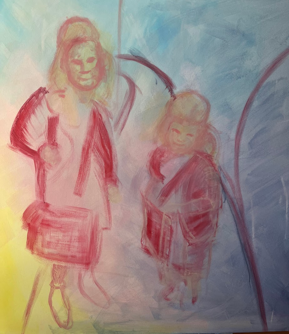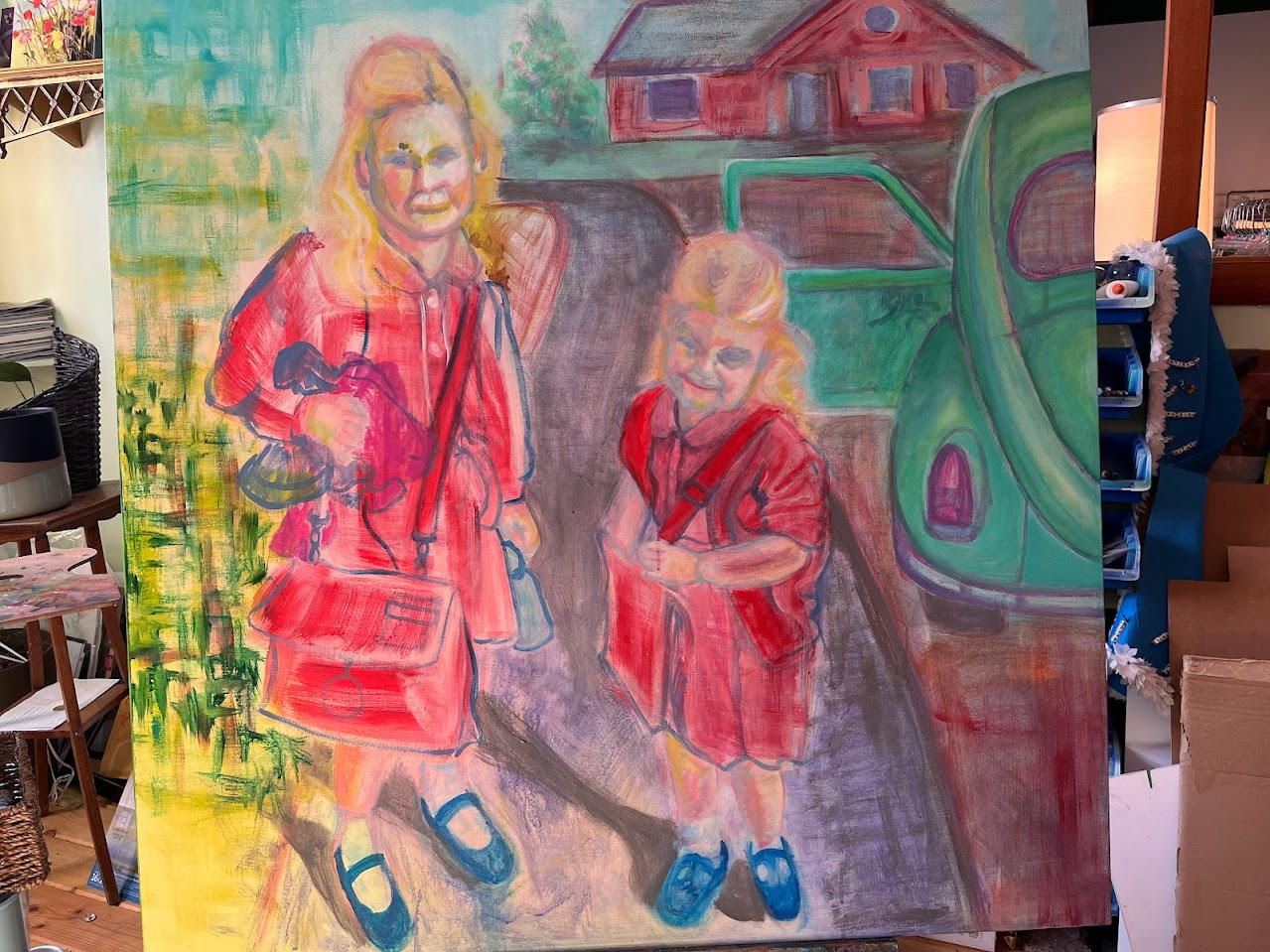 Mu husband asked if I could use the photo for a painting and I placed a car in the photo, as if they are just dropped off (and I like the green with the red) and I placed a house in the back.