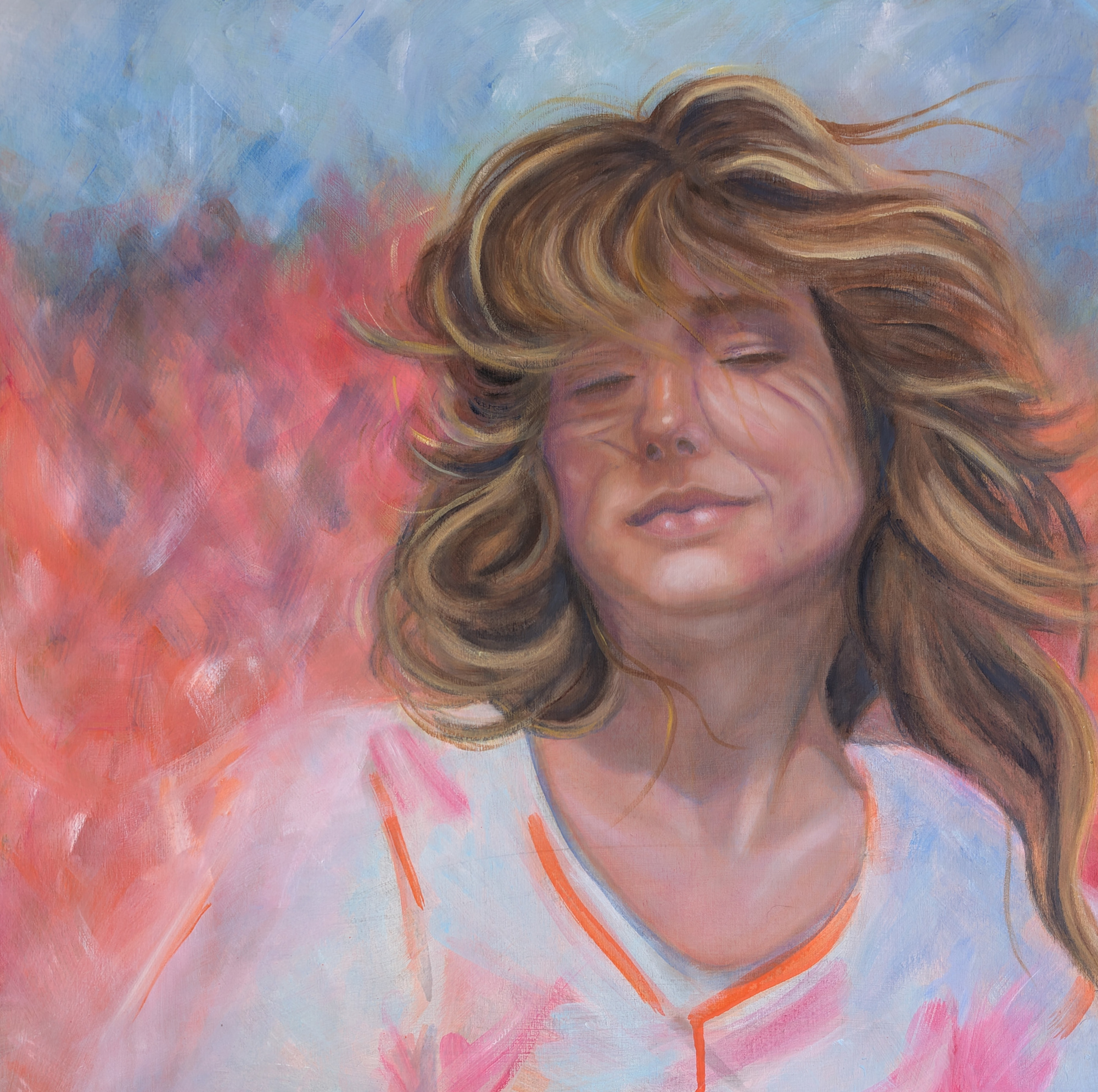 'Free', captures a fleeting moment of calm amid movement. The subject's windswept hair and peaceful expression evoke a deep sense of introspection, joy, and liberation. Set against a backdrop of bold, impressionistic strokes in orange, pink and sky blue, this piece invites the viewer into a dreamlike emotional space where time seems to slow. Painted with expressive brushwork and a dynamic color palette, this work balances energy with stillness, making it a powerful focal point for any space.