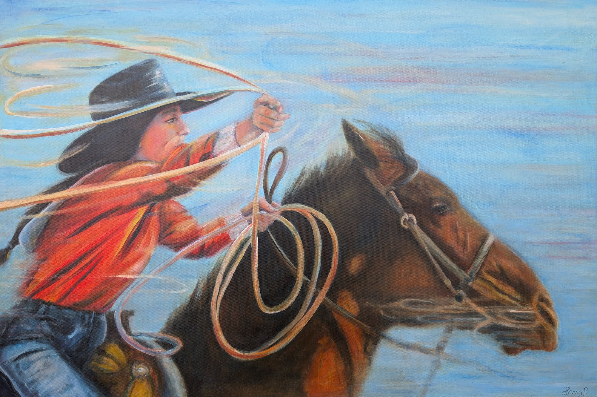 Katie is a local girl that loves rodeo, I wanted to try and paint her in action. She sent me some photo's of her rodeo roping and I went to work.